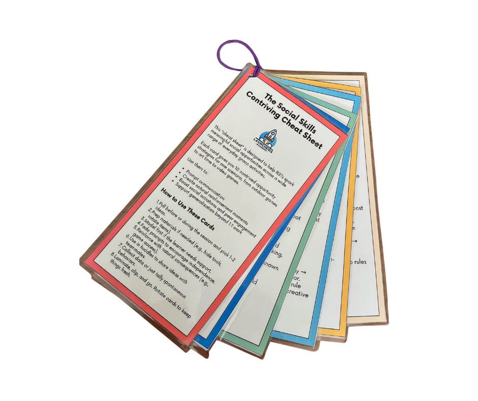 Running social groups means thinking on your feet — and that’s exactly where this tool shines. The Social Skills Contriving Cheat Sheet puts 100 ready-to-use strategies right in your pocket. From outdoor play and art time to board games, circle time, and even video games, each card gives simple, creative ways to spark: